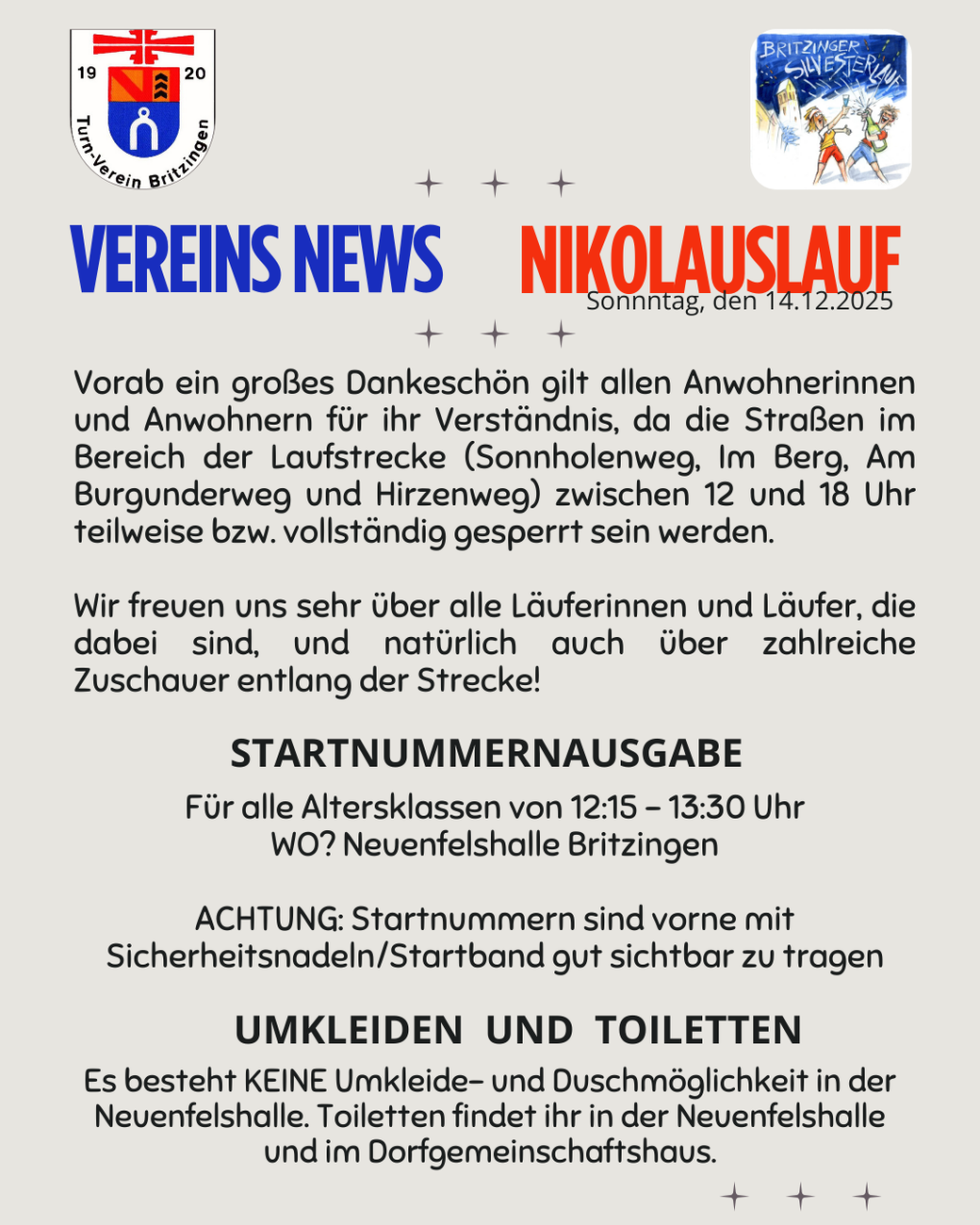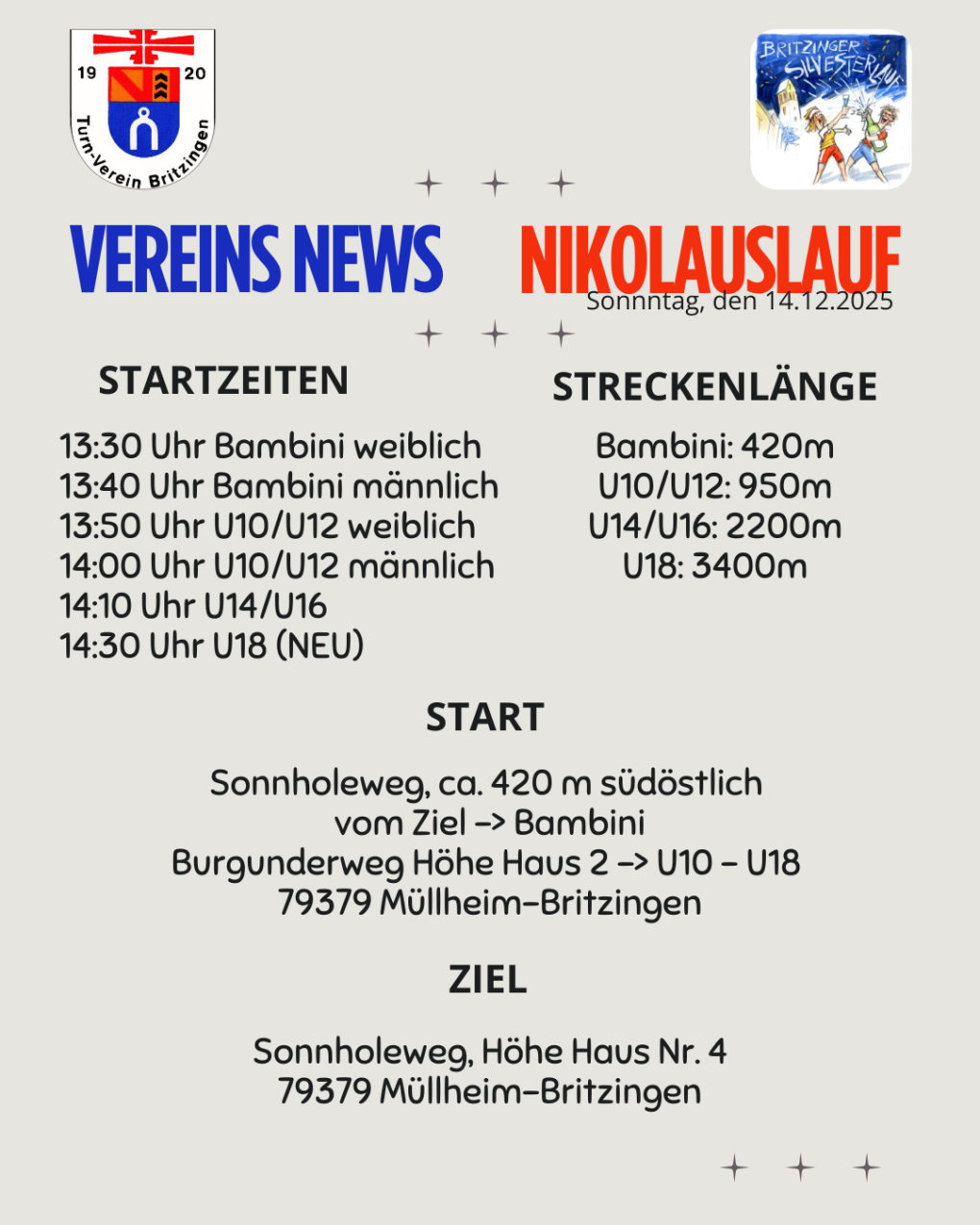 Der Nikolauslauf –nur für Schüler/-innen und Jugendliche bis U18- findet am 14.12.2025 und der traditionelle Britzinger Silvesterlauf am 31.12.2025 statt. Anmeldungen für beide Veranstaltungen sind schon möglich und finden bereits jetzt sensationellen Zuspruch.